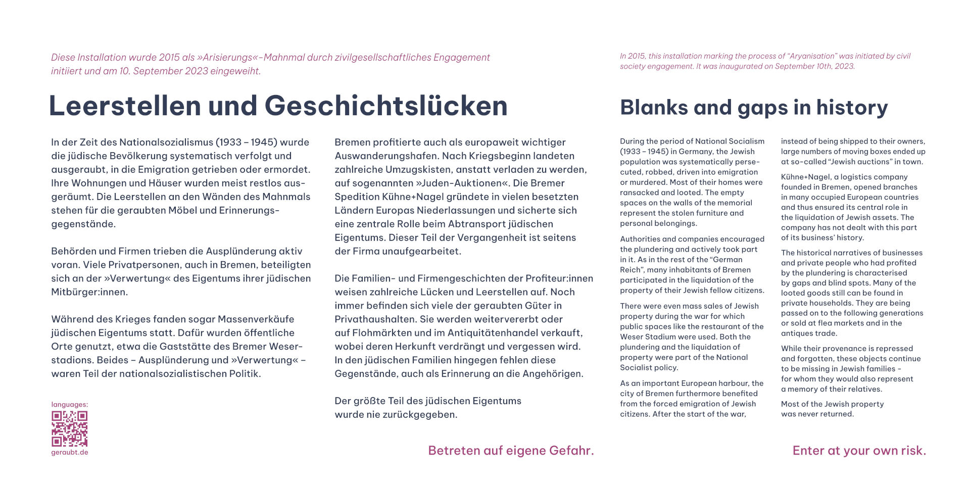 The slow process surrounding the text panels corresponds to the history of the memorial itself. After the rapid, cross-party decision to build the memorial in November 2016, it took seven years before the memorial at the Tiefer could be inaugurated in September 2023. Many difficulties had to be overcome, but the disputes over the location of the memorial were particularly time-consuming: what proximity, what visual relationship of the memorial to Kühne + Nagel is (historically and morally) appropriate?
