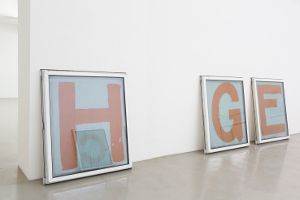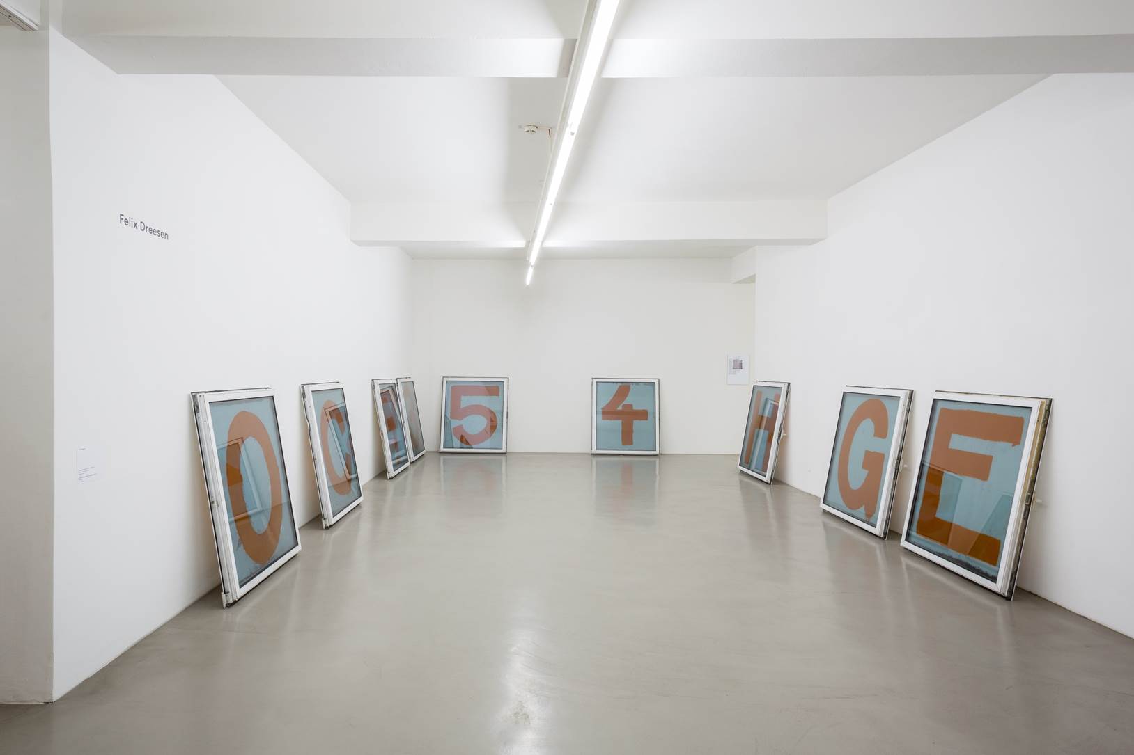 Neun Fenster lehnen an den Museumswänden. Auf die Scheiben der weißen Kunststofffenster sind große orangerote Lettern gemalt. Was wie eine minimalistische Geste anmutet, ist vielmehr eine Übertragung von Archivmaterial aus der unmittelbaren Nachbarschaft der Weserburg in den institutionellen Kunstkontext. Es sind neun von neunzig Fenstern der Fassade des Stammsitzes der Logistikfirma Kühne + Nagel. Die Buchstaben sind Fragmente eines Statements, das Unbekannte im Februar 2017, während der Abrissarbeiten zugunsten eines größeren Neubaus, in Erinnerung an die von dem Speditionsunternehmen verschwiegene eigene Rolle während der NS-Zeit an der Fassade angebracht hatten. Sie bilden den unzerstörten Bestand der bemalten Fenster. Die Botschaft an der Fassade wird nie mehr lesbar sein, doch die Leerstellen innerhalb der Installation Patches ofProtest(0C7354HGE) verweisen auf die fehlenden Fensterelemente. Rhythmisiert von verschieden großen Zwischenräumen basiert hier das serielle Prinzip nicht auf der Wiederholung und Spiegelung physischer Formen wie beispielsweise bei Donald Judds Untitled von 1968, sondern die serielle Narration der Leerstellen erklärt sich aus der Werklogik selbst, die auf eine von Weglassungen geprägte Geschichte zurückgeht.